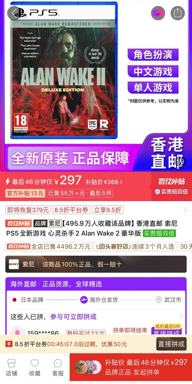3.PS5游戏《心灵杀手2豪华版》欧版中文297元全新包邮,恐怖游戏佳作,最近其数字版也在PSN港服商店打五折,DLC豪华升级包也是,加起来就是豪华版了,但实体版还带1代兑换码,所以推荐喜欢实体版的玩家入手,值得一提的是欧版游戏兑换码需要准备一个PSN欧服账号,届时绑定PS5机器切主账号游玩也没啥问题。